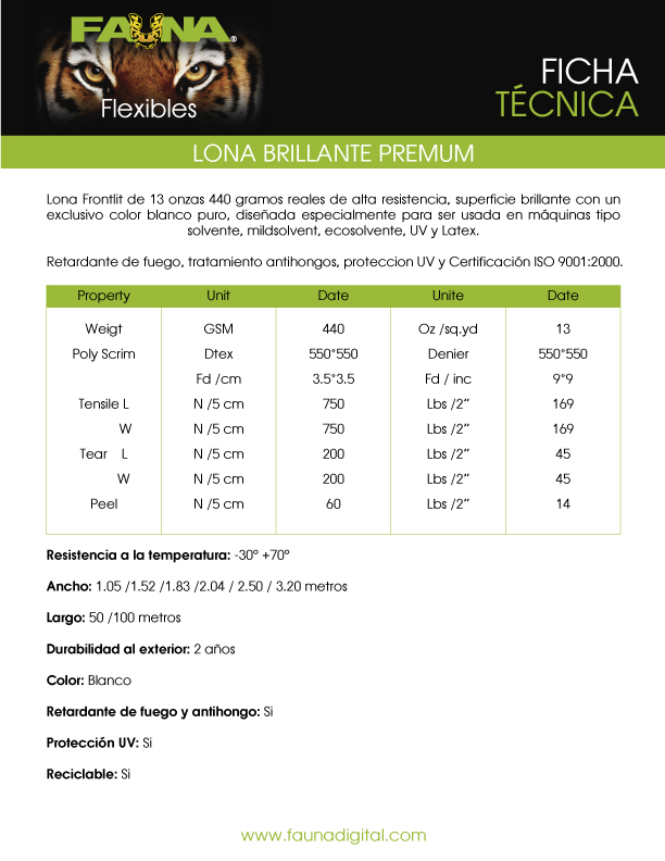 Lona Frontlit de 13 onzas 440 gramos reales de alta resistencia, superficie brillante con un exclusivo color blanco puro, diseñada especialmente para ser usada en máquinas tipo solvente, mildsolvent, ecosolvente, UV y Latex. Retardante de fuego, tratamiento antihongos, proteccion UV y Certificación ISO 9001:2000