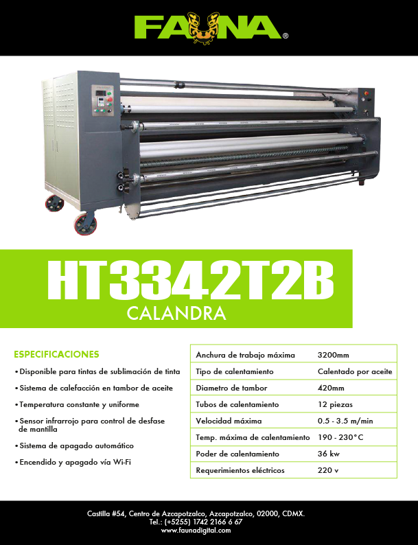 La Calandra HT - 3342 - T2B está diseñada para uso de transferencia de sublimación y calor de rollo a rollo o de pieza a pieza. Aplicación principal para textiles, mobiliario, ropa de playa, cortinas, mouse pads, alfombrillas de automóvil , etc.