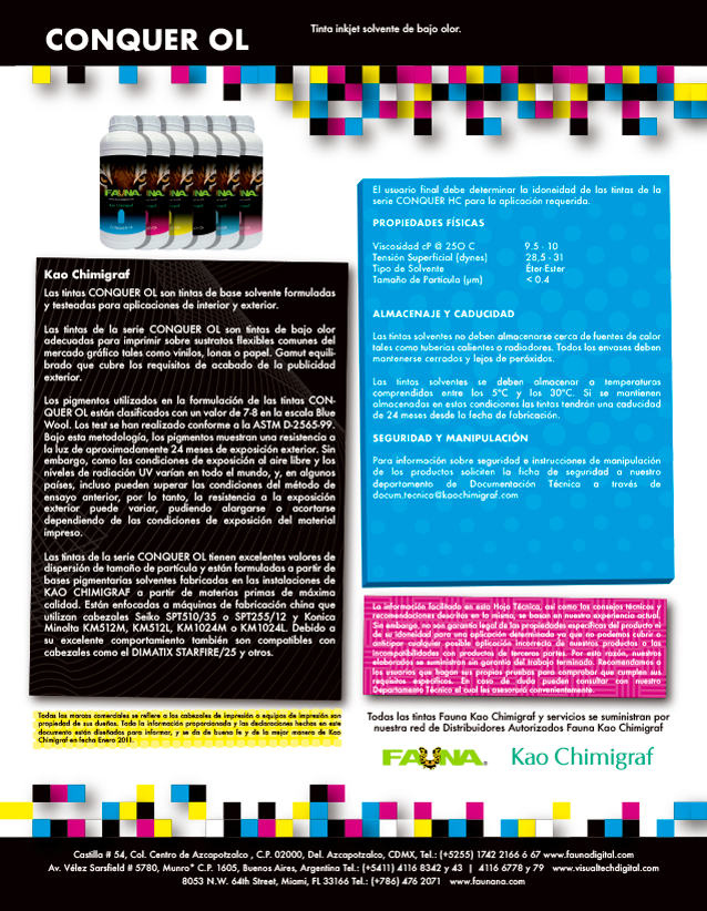 Las tintas de la serie CONQUER OL son tintas de bajo olor adecuadas para imprimir sobre sustratos flexibles comunes del mercado gráfico tales como vinilos, lonas o papel. Gamut equilibrado que cubre los requisitos de acabado de la publicidad exterior.