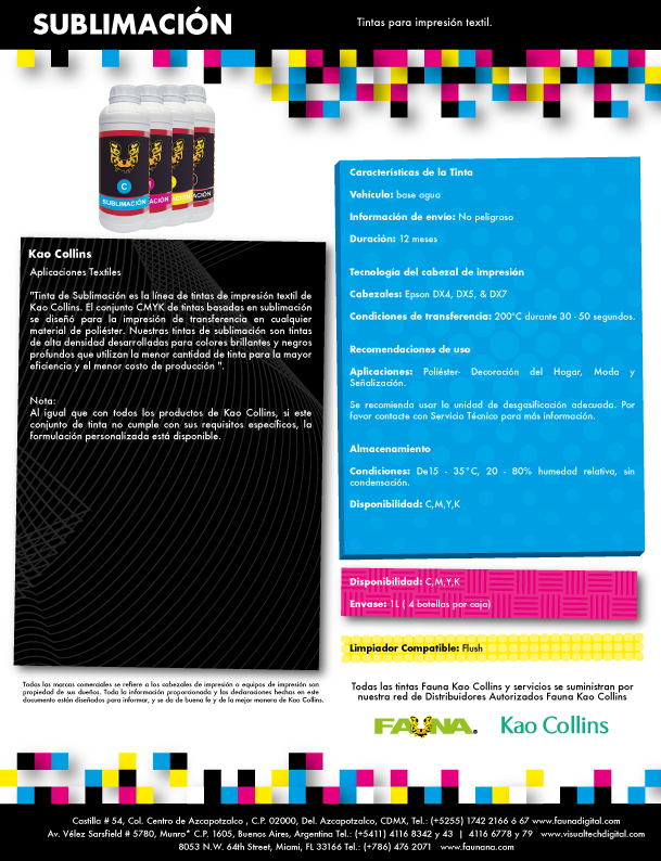 La tinta de Sublimación de Fauna Kao Chimigraf es el conjunto CMYK de tintas específicamente diseñadas para la impresión de transferencia en cualquier material de poliéster. Nuestras tintas de sublimación son tintas de alta densidad desarrolladas para colores brillantes y negros intensos que utilizan la menor cantidad de tinta para la mayor eficiencia y el menor costo de producción
